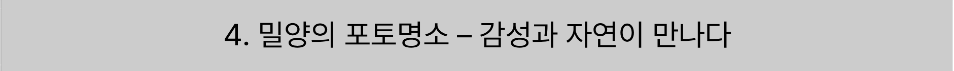 사진 찍기 좋은 밀양의 대표 명소는 위양지 외에도 다양합니다. ‘트윈터널’은 낮에는 아기자기한 포토존, 밤에는 환상적인 불빛으로 연인들에게 인기 만점입니다. ‘밀양강 스카이워크’는 강 위를 걷는 듯한 짜릿한 체험을 제공하며, 아래로 흐르는 강물과 주변 산세가 어우러져 최고의 인생샷을 남길 수 있습니다. 또한 ‘밀양댐 전망대’는 드라이브 후 잠시 들러 휴식하기 좋은 장소로, 햇살이 반사되는 수면이 그림처럼 펼쳐집니다. 이처럼 밀양의 포토명소는 단순한 관광지를 넘어, 자연 속에서 감성을 담는 공간으로 사랑받고 있습니다.
